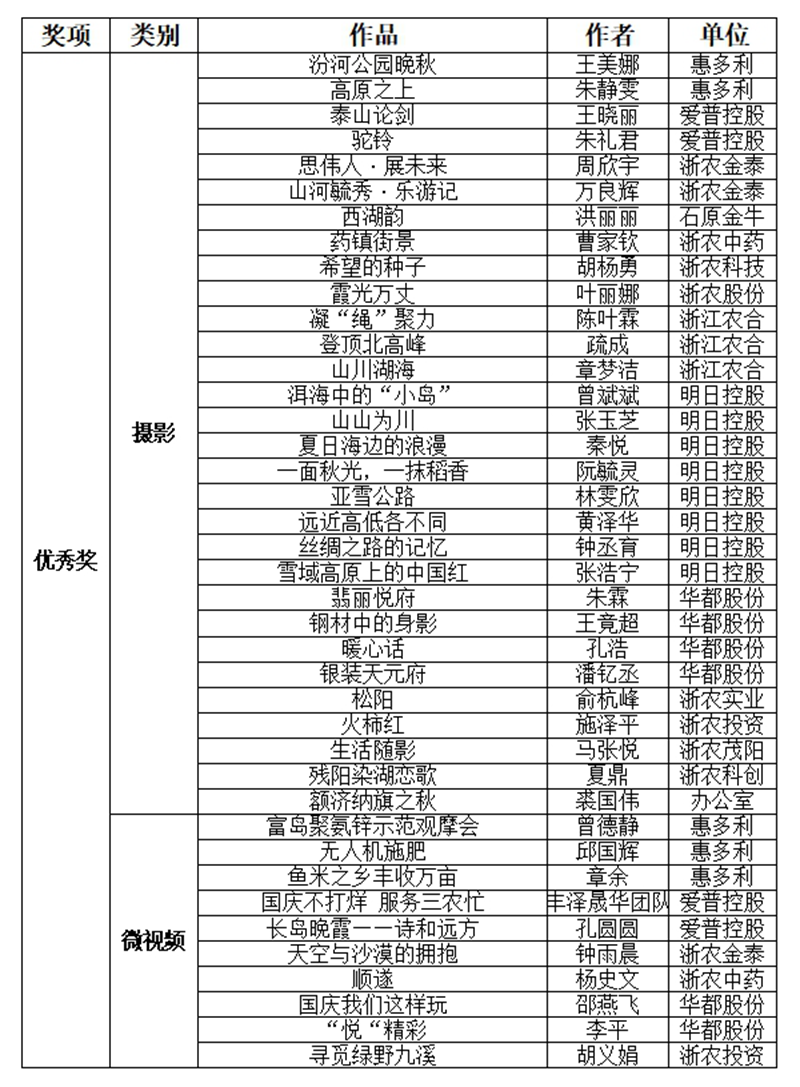經(jīng)集團(tuán)內(nèi)外評(píng)委評(píng)議,明日控股崔志浩的單幅作品《古代和現(xiàn)代的碰撞》、明日控股邱旸歆的組照作品《山河遠(yuǎn)闊 國(guó)泰民安》、浙農(nóng)科技符銀川的組照作品《沃野金麥繪豐圖:農(nóng)業(yè)夢(mèng)之卷》獲攝影組一等獎(jiǎng),明日控股俞濤《滄海一粟》等6件作品獲二等獎(jiǎng),惠多利韋揚(yáng)《晚秋》等9件作品獲三等獎(jiǎng);浙農(nóng)農(nóng)業(yè)甘良的作品《慶祝祖國(guó)母親生日快樂(lè)!》獲微視頻組一等獎(jiǎng),浙農(nóng)股份申琪婧《浙農(nóng)青年采菊活動(dòng)》、明日控股俞燁敏《最美風(fēng)景》獲二等獎(jiǎng),金誠(chéng)汽車陳練翠《信仰的顏色是紅色》、華通商貿(mào)陸嘉琦《山不見我,我自去見山》、明日控股蔡佳楠《山清水秀-大洋塢水庫(kù)》等3件作品獲三等獎(jiǎng)。